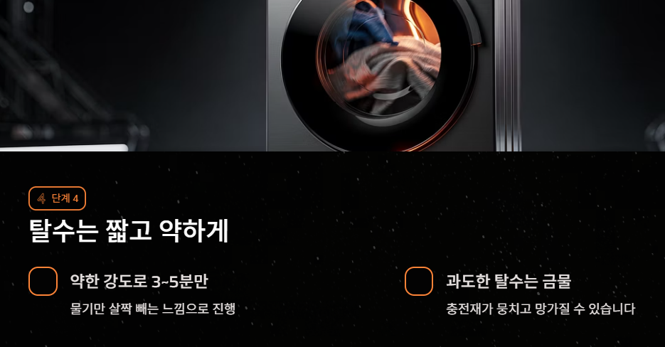 - 탈수는 너무 오래 돌리지 말고 약한 강도로 짧게(약 3~5분) 진행합니다. 물기만 살짝 뺀다는 느낌이 중요합니다.