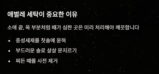 - 소매 끝, 목 부분 등 때가 타기 쉬운 곳은 중성세제를 묻힌 칫솔이나 부드러운 솔로 살살 문질러 미리 때를 벗겨줍니다. 전체 세탁만으로는 찌든 때가 잘 안 빠질 수 있습니다.