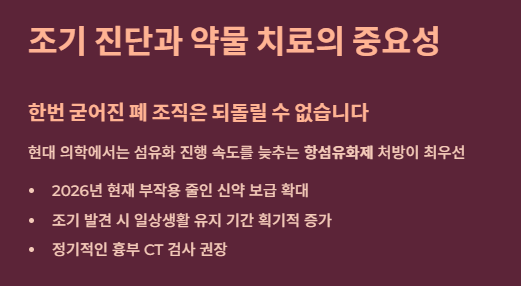 한번 굳어진 폐 조직은 안타깝게도 다시 원래대로 되돌릴 수 없습니다. 따라서 현대 의학에서는 섬유화 진행 속도를 늦추는 '항섬유화제' 처방을 최우선으로 합니다. 2026년 현재는 부작용을 줄인 신약들이 많이 보급되어, 조기에 발견만 한다면 일상생활을 유지할 수 있는 기간을 획기적으로 늘릴 수 있다는 것이 전문가들의 공통된 의견입니다.