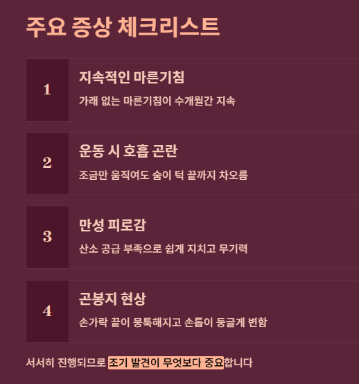 - 증상: 3개월 이상 지속되는 마른기침과 활동 시 숨 가쁨이 대표적입니다.