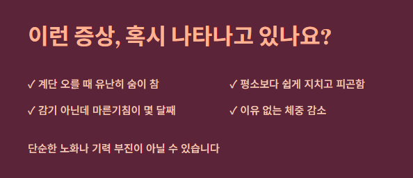 "평소처럼 계단을 오르는데 유난히 숨이 차고, 감기도 아닌데 마른기침이 몇 달째 가라앉지 않는다면?" 단순히 나이가 들어서, 혹은 기력 부진이라 생각하고 넘기기엔 우리 몸이 보내는 신호가 예사롭지 않을 때가 있습니다.