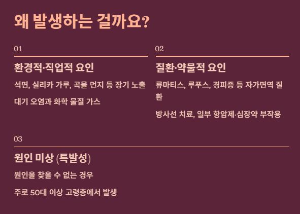- 원인: 직업적 분진 노출, 자가면역 질환, 그리고 원인 불명(특발성) 등이 있습니다.