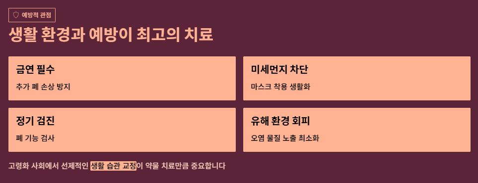 유전적 요인이나 질환이 없더라도 흡연이나 유해 환경 노출이 폐 섬유증을 가속화한다는 관점입니다. 특히 고령화 사회로 진입하면서 노인성 폐 질환이 급증하고 있는데, 미세먼지 차단 마스크 착용, 금연, 정기적인 폐 기능 검사 등 선제적인 생활 습관 교정이 약물 치료만큼이나 중요하다는 주장입니다.