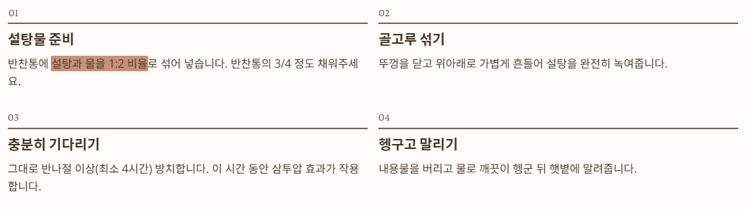 앞서 소개한 **설탕, 쌀뜨물, 베이킹소다**를 이용한 방식입니다.