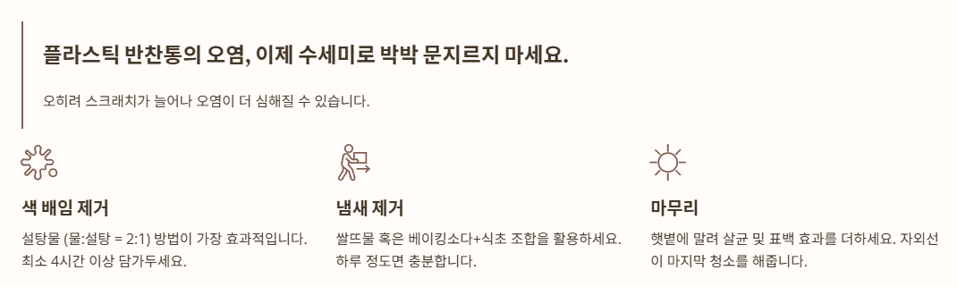 오늘은 집에서 쉽게 구할 수 있는 재료들로 **플라스틱 반찬통의 냄새와 색 배임을 완벽하게 제거하는 방법**을 정리해 드립니다.