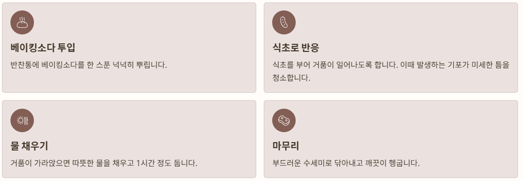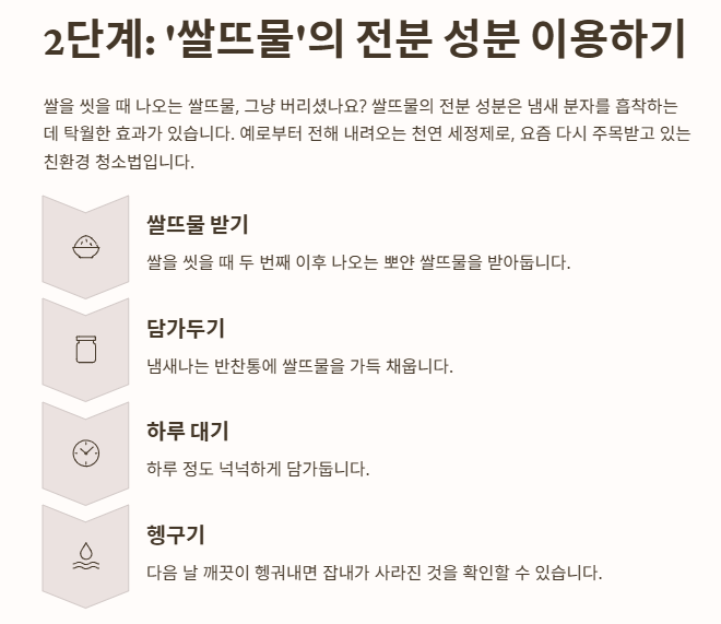 * **냄새 제거:** 쌀뜨물 혹은 베이킹소다+식초