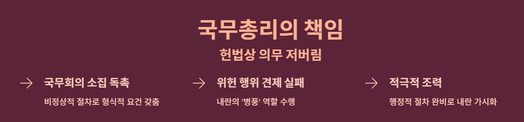 - 헌법적 견제 의무 저버림: 국무총리는 대통령의 위헌적 행위를 견제하고 보좌할 헌법상 의무가 있음에도 불구하고, 계엄의 위법성을 충분히 인식할 수 있는 상황에서 오히려 내란의 '병풍' 역할을 했다고 보았습니다.