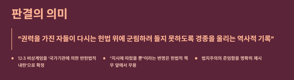 재판부는 이 판결이 "권력을 가진 자들이 다시는 헌법 위에 군림하려 들지 못하도록 경종을 울리는 역사적 기록"이 되어야 한다고 선언했습니다.