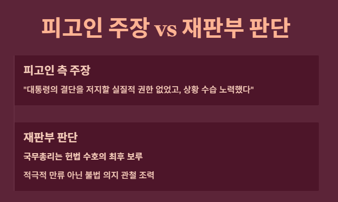 한 전 총리 측은 "대통령의 결단을 저지할 실질적 권한이 없었고, 자신은 상황을 수습하려 노력했다"고 항변했습니다. 그러나 재판부는 다음과 같이 일축했습니다.