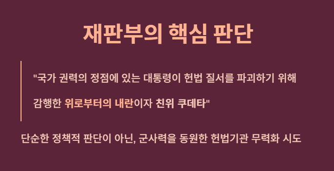 특히 이를 "국가 권력의 정점에 있는 대통령이 헌법 질서를 파괴하기 위해 감행한 '위로부터의 내란'이자 '친위 쿠데타'"라고 명명했습니다.