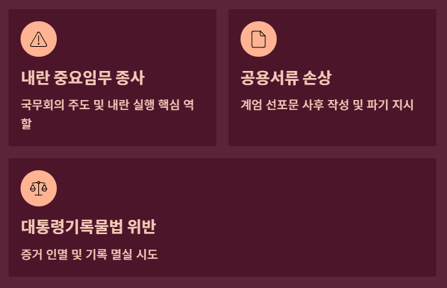 - 국무회의 소집 및 의결 주도: 계엄 선포 직전, 비정상적인 절차로 국무회의를 소집하고 국무위원들에게 독촉 전화를 돌려 계엄안의 형식적 요건을 갖추게 함으로써 내란 행위를 가시화하고 법적 외관을 부여했습니다.