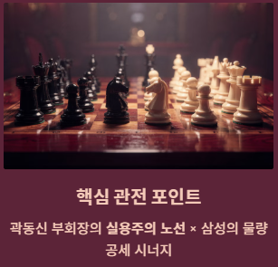 - 관전 포인트: "비즈니스와 감정은 별개"라는 곽동신 부회장의 실용주의 노선이 삼성전자의 물량 공세와 만나 어떤 시너지를 낼지가 핵심입니다.