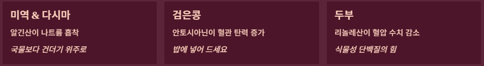 - 검은콩: '안토시아닌'이 풍부해 혈관 탄력을 높여줍니다. 밥에 넣어 먹는 것만으로도 훌륭한 혈압 관리식이 됩니다.