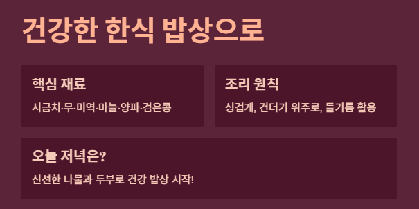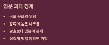 - 국물 요리의 변화: 국이나 찌개는 건더기 위주로 먹고, 국물에는 소금 대신 다시마, 멸치, 표고버섯 가루로 감칠맛을 내세요.
