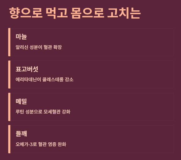 - 들깨: 오메가-3 지방산(알파-리놀렌산)이 풍부해 혈관 염증을 줄이고 혈압을 안정시킵니다.