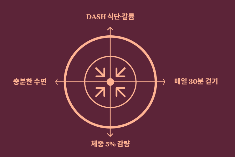 칼륨 위주의 식단(DASH), 매일 30분 걷기, 체중 5% 감량, 그리고 충분한 수면이 혈압 낮추기의 4대 기둥입니다.