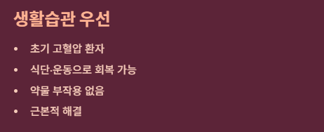 초기 고혈압이나 전단계 환자에게 해당합니다. 식단과 운동만으로 충분히 정상 수치 회복이 가능하며, 약의 부작용 걱정 없이 건강을 지킬 수 있다는 관점입니다.