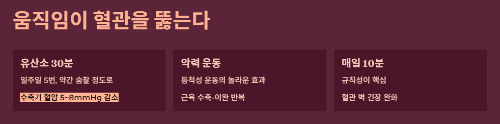 일시적인 고강도 운동보다는 매일 10분이라도 규칙적으로 움직이는 것이 혈관 벽의 긴장을 완화하는 데 유리합니다.