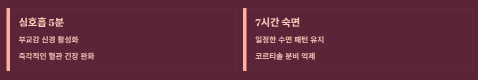 혈압이 오르는 느낌이 들 때 5분간 천천히 심호흡을 하세요. 부교감 신경이 활성화되면서 즉각적으로 혈관 긴장이 풀립니다.