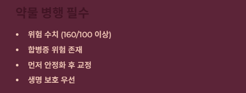 혈압이 이미 위험 수치(160/100mmHg 이상)이거나 합병증 위험이 있는 경우입니다. 이때는 생활 습관만 고집하는 것이 오히려 위험할 수 있으며, 약으로 혈압을 먼저 안정시킨 뒤 습관을 교정해야 한다는 시각입니다.