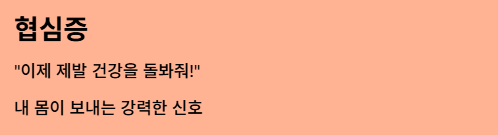 - 협심증: "가슴이 짓눌리는 느낌", "답답함" 정도로 표현됩니다.