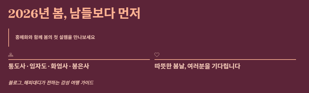오늘은 2026년 봄, 남들보다 한발 앞서 봄을 만끽할 수 있는 홍매화 개화시기와 전국 명소를 완벽하게 정리해 드립니다.