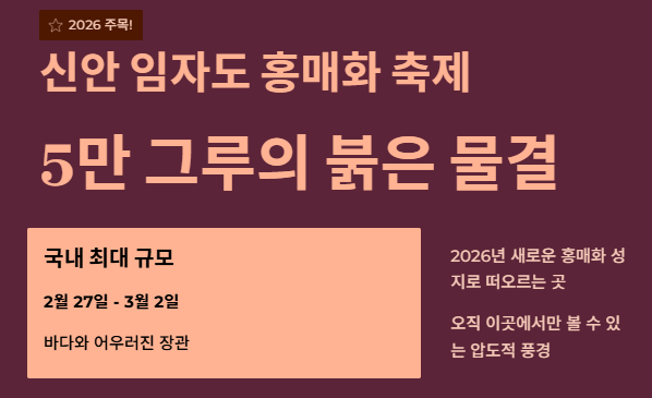- 2026년 신설된 신안 임자도 축제는 새로운 홍매화 성지로 떠오르고 있습니다.