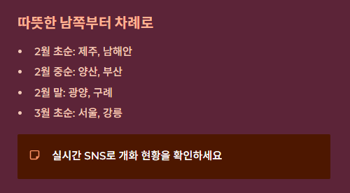 | 지역 | 예상 개화 시기 | 피크(만개) 시점 |