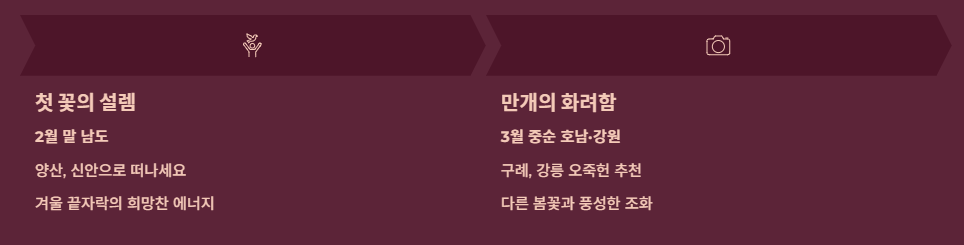 - **남부권(통도사, 임자도)**에서 시작해 **중부권(봉은사, 오죽헌)**으로 북상하며 개화합니다.