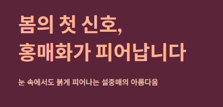 "겨울이 언제 끝나나..." 싶을 때, 가장 먼저 붉은빛으로 봄을 알리는 전령사가 있습니다. 바로 홍매화인데요. 하얀 눈 속에서 피어난다고 해서 '설중매'라고도 불리는 이 꽃은 벚꽃보다 강렬하고 산수유보다 우아한 멋이 있죠.
