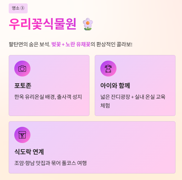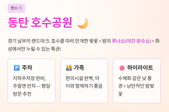 2. 명소: 동탄 호수공원(야경), 발안천(긴 산책로), 우리꽃식물원(유채꽃 콜라보).
