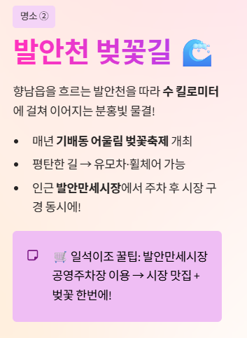 향남읍을 흐르는 발안천을 따라 수 킬로미터 이어진 벚꽃길은 장관 그 자체입니다. 매년 '기배동 어울림 벚꽃축제' 등이 열리며, 하천 옆으로 난 평탄한 길 덕분에 유모차나 휠체어를 동반한 가족 단위 나들이객에게 최고의 장소입니다.