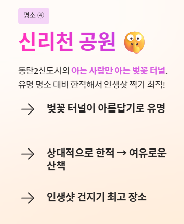 동탄2신도시에 위치한 신리천은 벚꽃 터널이 아름답기로 유명합니다. 다른 유명 명소에 비해 상대적으로 한적하여 여유롭게 '인생샷'을 남기고 싶은 분들에게 강력 추천하는 숨은 보석입니다.