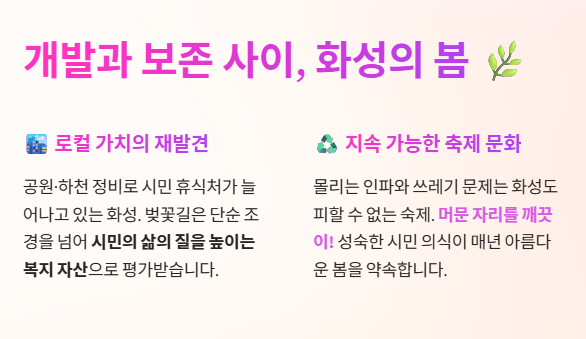 과거 화성은 개발 중심의 도시였지만, 최근에는 공원과 하천을 정비하며 시민들의 휴식처를 늘려가고 있습니다. 벚꽃길 조성은 도시의 미관뿐만 아니라 시민들의 '삶의 질'을 높이는 중요한 복지 자산으로 평가받습니다.