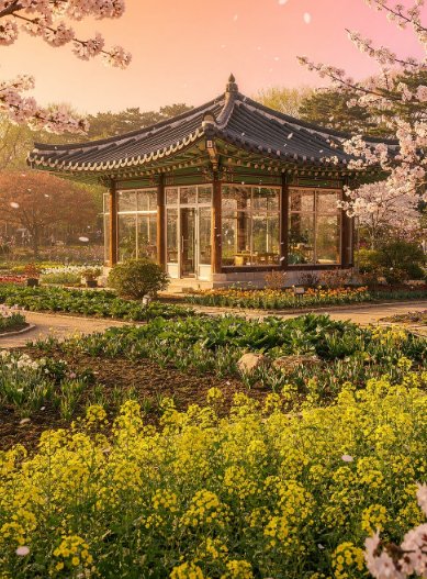 팔탄면에 위치한 이곳은 벚꽃뿐만 아니라 노란 유채꽃을 동시에 볼 수 있어 색감이 화려합니다. 한옥 양식의 유리온실과 어우러진 봄꽃들은 출사객들에게 이미 정평이 나 있는 포토존입니다.