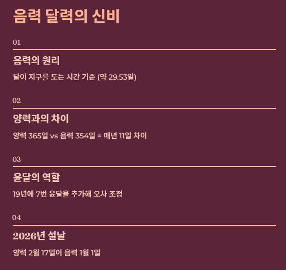 음력은 달이 지구를 한 바퀴 도는 시간(약 29.53일)을 기준으로 합니다. 이 때문에 양력(365일)과 음력(약 354일) 사이에는 매년 약 11일의 차이가 발생하죠.