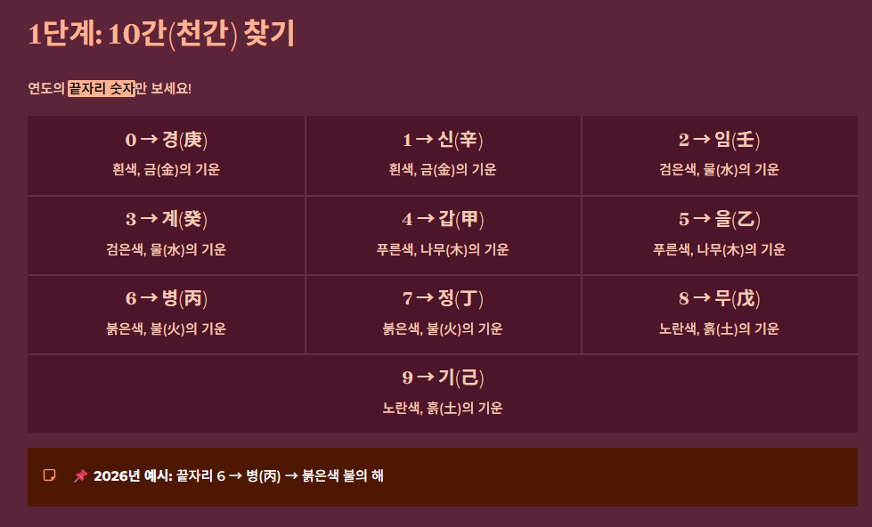 10간은 연도의 끝자리 숫자에 따라 결정됩니다. 아주 간단한 규칙이죠.