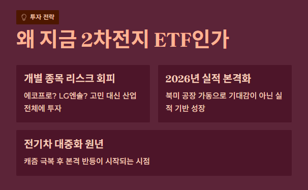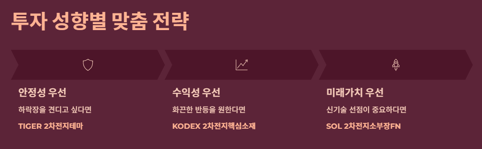 | TIGER 2차전지테마 | 소재, 셀, 장비 등 밸류체인 통합 투자 | 안정적 우상향 추구형 |