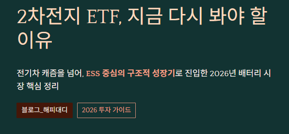 최근 전기차 캐즘(일시적 수요 정체) 우려를 털어내고, 에너지저장장치(ESS) 시장의 급성장과 함께 다시 주목받고 있는 '2차전지 ETF'에 대해 정리해 드립니다. 2026년 현재, 어떤 포인트에 집중해야 할지 핵심만 뽑았습니다.
