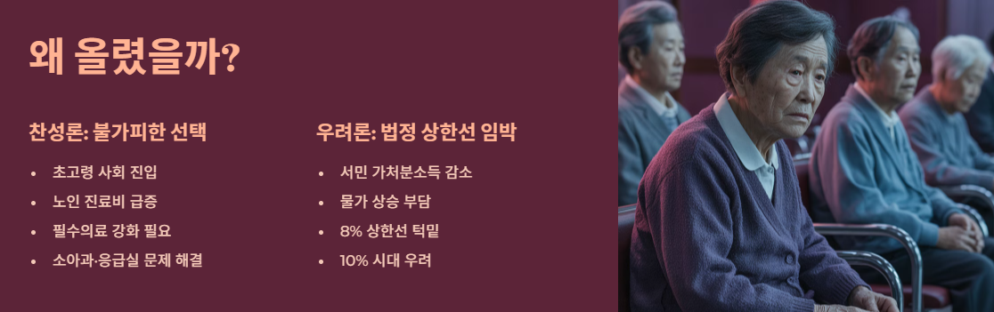 - 초고령 사회 진입: 노인 진료비가 기하급수적으로 늘어나고 있어, 수입(보험료)을 늘리지 않으면 곳간이 빕니다.
