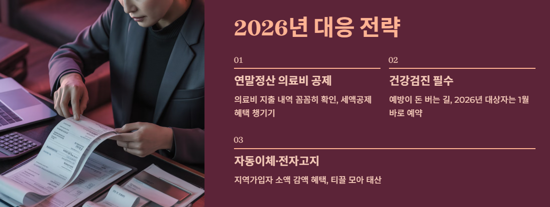 - 건강검진은 필수: 아파서 병원비를 쓰는 것보다, 예방이 돈을 버는 길입니다. 2026년 검진 대상자라면 1월에 바로 예약하세요. (연말엔 예약이 힘듭니다!)