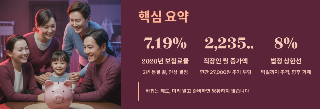 2026년 1월부터 건강보험료율이 7.19%로 인상됩니다. 지난 2년간의 동결이 끝나고 직장인은 월평균 약 2천 원, 지역가입자는 약 1천 원 정도 더 내게 됩니다. 고령화와 필수의료 확충을 위한 불가피한 조치라지만, 법정 상한선인 8%에 가까워지고 있다는 점은 우리 사회가 함께 고민해야 할 무거운 숙제입니다.