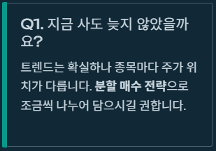 A1. 시장의 트렌드는 확실하지만, 종목마다 주가 위치가 다릅니다. 한꺼번에 큰돈을 넣기보다는 '적립식 펀드'처럼 조금씩 나누어 담으시는 분할 매수 전략을 권해드립니다.