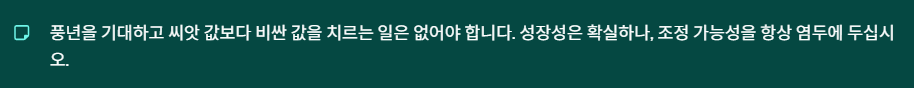 아무리 좋은 종목이라도 주가가 너무 가파르게 올랐다면 주의가 필요합니다. 일부 종목은 미래의 가치를 미리 당겨와서 PER(주가수익비율)이 지나치게 높게 형성되어 있기도 합니다. 농사로 치면, 풍년을 기대하고 씨앗 값보다 비싼 값을 치르는 셈이지요. 또한 글로벌 경기 침체 여부에 따라 기업들의 설비 투자 속도가 조절될 수 있다는 점도 염두에 두셔야 합니다.