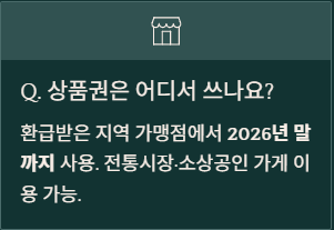 A2. 환급받은 지역의 가맹점에서 2026년 말까지 사용 가능합니다. 지역 내 소상공인 가게나 전통시장 등에서 자유롭게 쓸 수 있습니다.