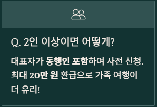 A3. 대표자가 사전 신청을 할 때 동행인을 포함하여 계획을 제출하면 됩니다. 최대 20만 원까지 환급되므로 가족이나 친구와 함께 갈 때 훨씬 유리합니다.