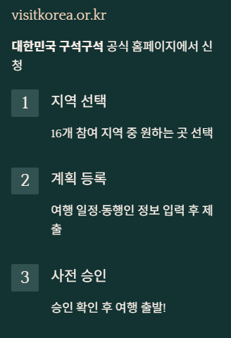 - 사전 신청 (필수): 여행 전, 대한민국 구석구석(visitkorea.or.kr) 사이트에 접속하여 원하는 지역과 여행 계획을 등록하고 사전 승인을 받으세요.