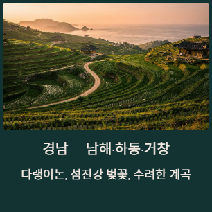 | 경남 | 밀양시, 하동군, 합천군, 거창군, 남해군 |