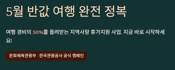 따뜻한 5월, 가족이나 친구들과 국내 여행을 계획하고 계신가요? 여행 경비가 부담스럽다면 지금 바로 '지역사랑 휴가지원(반값 여행)' 사업을 확인하세요. 지정된 인구감소지역을 여행하면 사용 경비의 50%를 모바일 지역사랑상품권으로 환급받을 수 있는 절호의 기회입니다.
