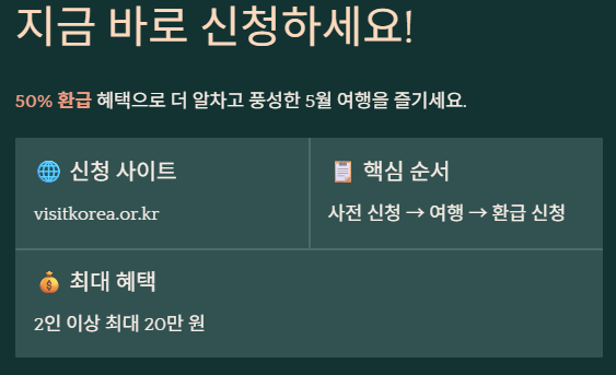 2026년 5월 여행을 계획 중이라면 '대한민국 구석구석' 홈페이지에서 사전 여행 계획을 승인받는 것이 가장 중요합니다. 50% 환급 혜택은 예산 소진 시 조기 종료되니 지금 바로 계획을 세워 신청하세요. 알뜰한 여행 지원금 혜택을 챙겨 더 풍성한 5월 나들이 즐기시길 바랍니다!